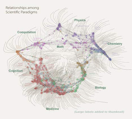 “Larger paradigms have more papers; node proximity and darker links indicate how many papers are shared between two paradigms. Flowing labels list common words unique to each paradigm, large labels general areas of scientific inquiry.”